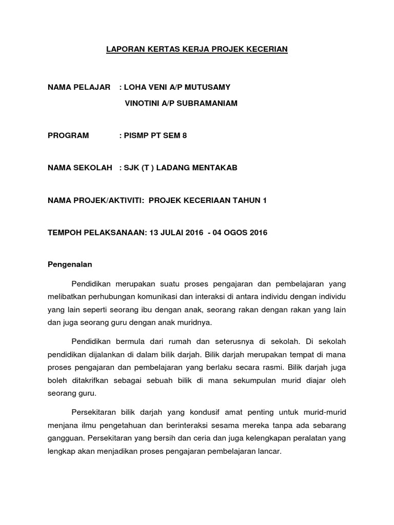Laporan Kertas Kerja Projek Kecerian Tahun 1 Pdf